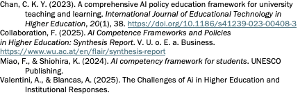 Uno de los mayores desafíos actuales para las instituciones de educación superior es el desarrollo de competencias para el uso responsable, ético y eficaz de la IA generativa (Collaboration, 2025). Negar su uso o ignorar su presencia puede llevar a escenarios poco deseables: estudiantes que no saben utilizarla correctamente o que recurren a ella de forma que compromete la integridad académica. Integrarla al currículo permite que su enseñanza sea colectiva, guiada y contextualizada, y no un proceso aislado o improvisado.
